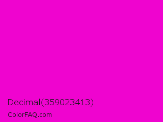 Decimal 359023413 Color is a normal magenta color and the nearest color is Purple Pizzazz #ff00cc. Hex code #ef04cf and RGB value is rgb(239,4,207). In RGB color space, this color is composed of 94% red, 2% green, 81% blue, In CMYK color space, this color is composed of 0% cyan, 98% magenta, 13% yellow , 6% black , In HSL color space, this color has a hue angle of 308° , 97% saturation and 48% lightness.