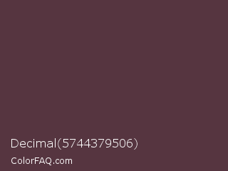 Decimal 5744379506 Color is a dark rose color and the nearest color is Dark Puce #4f3a3c. Hex code #563540 and RGB value is rgb(86,53,64). In RGB color space, this color is composed of 34% red, 21% green, 25% blue, In CMYK color space, this color is composed of 0% cyan, 38% magenta, 26% yellow , 66% black , In HSL color space, this color has a hue angle of 340° , 24% saturation and 27% lightness.