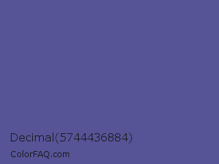 Decimal 5744436884 Color is a normal indigo color and the nearest color is Butterfly Bush #624e9a. Hex code #565496 and RGB value is rgb(86,84,150). In RGB color space, this color is composed of 34% red, 33% green, 59% blue, In CMYK color space, this color is composed of 43% cyan, 44% magenta, 0% yellow , 41% black , In HSL color space, this color has a hue angle of 242° , 28% saturation and 46% lightness.