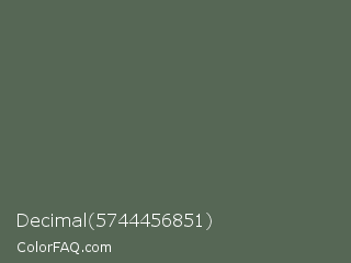 Decimal 5744456851 Color is a normal green color and the nearest color is Finlandia #556d56. Hex code #566755 and RGB value is rgb(86,103,85). In RGB color space, this color is composed of 34% red, 40% green, 33% blue, In CMYK color space, this color is composed of 17% cyan, 0% magenta, 17% yellow , 60% black , In HSL color space, this color has a hue angle of 117° , 10% saturation and 37% lightness.