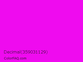 Decimal 359031129 Color is a normal magenta color and the nearest color is Phlox #df00ff. Hex code #ef0bef and RGB value is rgb(239,11,239). In RGB color space, this color is composed of 94% red, 4% green, 94% blue, In CMYK color space, this color is composed of 0% cyan, 95% magenta, 0% yellow , 6% black , In HSL color space, this color has a hue angle of 300° , 91% saturation and 49% lightness.
