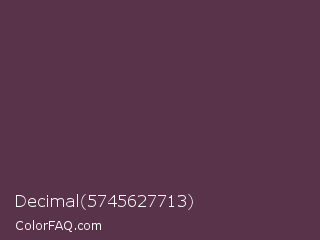 Decimal 5745627713 Color is a dark magenta color and the nearest color is Voodoo #533455. Hex code #583349 and RGB value is rgb(88,51,73). In RGB color space, this color is composed of 35% red, 20% green, 29% blue, In CMYK color space, this color is composed of 0% cyan, 42% magenta, 17% yellow , 65% black , In HSL color space, this color has a hue angle of 324° , 27% saturation and 27% lightness.