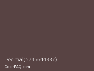 Decimal 5745644337 Color is a dark red color and the nearest color is Kabul #5e483e. Hex code #584343 and RGB value is rgb(88,67,67). In RGB color space, this color is composed of 35% red, 26% green, 26% blue, In CMYK color space, this color is composed of 0% cyan, 24% magenta, 24% yellow , 65% black , In HSL color space, this color has a hue angle of 0° , 14% saturation and 30% lightness.