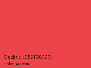 Decimal 359138097 Color is a normal red color and the nearest color is Desire #ea3c53. Hex code #ef434b and RGB value is rgb(239,67,75). In RGB color space, this color is composed of 94% red, 26% green, 29% blue, In CMYK color space, this color is composed of 0% cyan, 72% magenta, 69% yellow , 6% black , In HSL color space, this color has a hue angle of 357° , 84% saturation and 60% lightness.