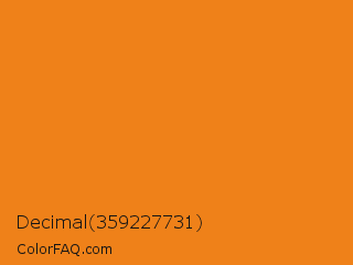 Decimal 359227731 Color is a normal orange color and the nearest color is Tango #ed7a1c. Hex code #ef8119 and RGB value is rgb(239,129,25). In RGB color space, this color is composed of 94% red, 51% green, 10% blue, In CMYK color space, this color is composed of 0% cyan, 46% magenta, 90% yellow , 6% black , In HSL color space, this color has a hue angle of 29° , 87% saturation and 52% lightness.