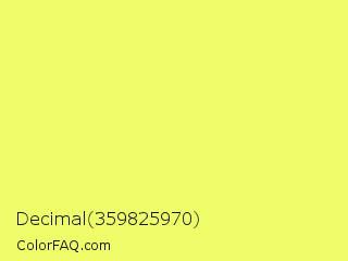 Decimal 359825970 Color is a light yellow color and the nearest color is Canary #f3fb62. Hex code #effe68 and RGB value is rgb(239,254,104). In RGB color space, this color is composed of 94% red, 100% green, 41% blue, In CMYK color space, this color is composed of 6% cyan, 0% magenta, 59% yellow , 0% black , In HSL color space, this color has a hue angle of 66° , 99% saturation and 70% lightness.
