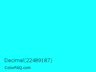 Decimal 22489187 Color is a normal cyan color and the nearest color is Loeen #15f2fd. Hex code #17ffff and RGB value is rgb(23,255,255). In RGB color space, this color is composed of 9% red, 100% green, 100% blue, In CMYK color space, this color is composed of 91% cyan, 0% magenta, 0% yellow , 0% black , In HSL color space, this color has a hue angle of 180° , 100% saturation and 55% lightness.