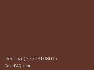 Decimal 5757310801 Color is a dark red color and the nearest color is Irish Coffee #5f3d26. Hex code #603427 and RGB value is rgb(96,52,39). In RGB color space, this color is composed of 38% red, 20% green, 15% blue, In CMYK color space, this color is composed of 0% cyan, 46% magenta, 59% yellow , 62% black , In HSL color space, this color has a hue angle of 14° , 42% saturation and 26% lightness.