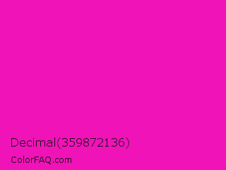 Decimal 359872136 Color is a normal magenta color and the nearest color is Shocking Pink #fc0fc0. Hex code #f013b8 and RGB value is rgb(240,19,184). In RGB color space, this color is composed of 94% red, 7% green, 72% blue, In CMYK color space, this color is composed of 0% cyan, 92% magenta, 23% yellow , 6% black , In HSL color space, this color has a hue angle of 315° , 88% saturation and 51% lightness.