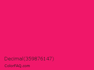 Decimal 359876147 Color is a normal rose color and the nearest color is Razzmatazz #e3256b. Hex code #f01769 and RGB value is rgb(240,23,105). In RGB color space, this color is composed of 94% red, 9% green, 41% blue, In CMYK color space, this color is composed of 0% cyan, 90% magenta, 56% yellow , 6% black , In HSL color space, this color has a hue angle of 337° , 88% saturation and 52% lightness.