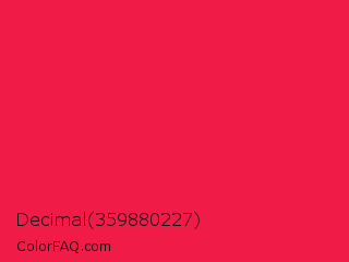 Decimal 359880227 Color is a normal red color and the nearest color is Red Crayola #ee204d. Hex code #f01b47 and RGB value is rgb(240,27,71). In RGB color space, this color is composed of 94% red, 11% green, 28% blue, In CMYK color space, this color is composed of 0% cyan, 89% magenta, 70% yellow , 6% black , In HSL color space, this color has a hue angle of 348° , 88% saturation and 52% lightness.