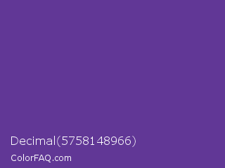 Decimal 5758148966 Color is a normal violet color and the nearest color is Rebecca Purple #663399. Hex code #613796 and RGB value is rgb(97,55,150). In RGB color space, this color is composed of 38% red, 22% green, 59% blue, In CMYK color space, this color is composed of 35% cyan, 63% magenta, 0% yellow , 41% black , In HSL color space, this color has a hue angle of 267° , 46% saturation and 40% lightness.