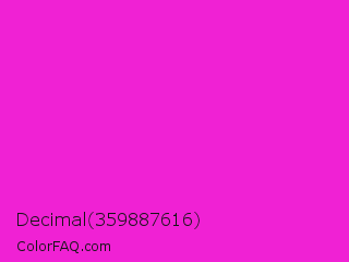 Decimal 359887616 Color is a normal magenta color and the nearest color is Hot Magenta #ff1dce. Hex code #f021d4 and RGB value is rgb(240,33,212). In RGB color space, this color is composed of 94% red, 13% green, 83% blue, In CMYK color space, this color is composed of 0% cyan, 86% magenta, 12% yellow , 6% black , In HSL color space, this color has a hue angle of 308° , 87% saturation and 54% lightness.