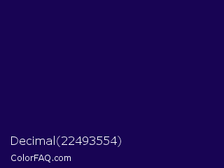 Decimal 22493554 Color is a very dark indigo color and the nearest color is Tolopea #1b0245. Hex code #180454 and RGB value is rgb(24,4,84). In RGB color space, this color is composed of 9% red, 2% green, 33% blue, In CMYK color space, this color is composed of 71% cyan, 95% magenta, 0% yellow , 67% black , In HSL color space, this color has a hue angle of 255° , 91% saturation and 17% lightness.