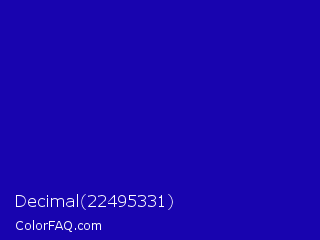 Decimal 22495331 Color is a normal indigo color and the nearest color is Zaffre #0014a8. Hex code #1804af and RGB value is rgb(24,4,175). In RGB color space, this color is composed of 9% red, 2% green, 69% blue, In CMYK color space, this color is composed of 86% cyan, 98% magenta, 0% yellow , 31% black , In HSL color space, this color has a hue angle of 247° , 96% saturation and 35% lightness.