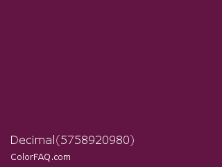 Decimal 5758920980 Color is a dark magenta color and the nearest color is Tawny Port #692545. Hex code #621542 and RGB value is rgb(98,21,66). In RGB color space, this color is composed of 38% red, 8% green, 26% blue, In CMYK color space, this color is composed of 0% cyan, 79% magenta, 33% yellow , 62% black , In HSL color space, this color has a hue angle of 325° , 65% saturation and 23% lightness.