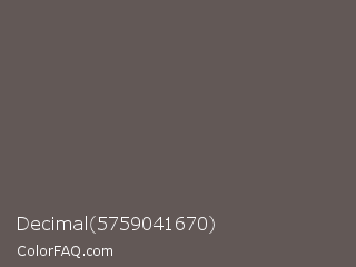 Decimal 5759041670 Color is a normal red color and the nearest color is Wenge #645452. Hex code #625856 and RGB value is rgb(98,88,86). In RGB color space, this color is composed of 38% red, 35% green, 34% blue, In CMYK color space, this color is composed of 0% cyan, 10% magenta, 12% yellow , 62% black , In HSL color space, this color has a hue angle of 10° , 7% saturation and 36% lightness.