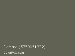 Decimal 5759051332 Color is a normal yellow color and the nearest color is Siam #646a54. Hex code #626254 and RGB value is rgb(98,98,84). In RGB color space, this color is composed of 38% red, 38% green, 33% blue, In CMYK color space, this color is composed of 0% cyan, 0% magenta, 14% yellow , 62% black , In HSL color space, this color has a hue angle of 60° , 8% saturation and 36% lightness.