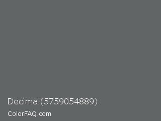 Decimal 5759054889 Color is a normal cyan color and the nearest color is Storm Dust #646463. Hex code #626565 and RGB value is rgb(98,101,101). In RGB color space, this color is composed of 38% red, 40% green, 40% blue, In CMYK color space, this color is composed of 3% cyan, 0% magenta, 0% yellow , 60% black , In HSL color space, this color has a hue angle of 180° , 2% saturation and 39% lightness.
