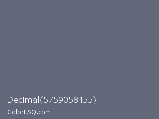 Decimal 5759058455 Color is a normal blue color and the nearest color is Nevada #646e75. Hex code #626879 and RGB value is rgb(98,104,121). In RGB color space, this color is composed of 38% red, 41% green, 47% blue, In CMYK color space, this color is composed of 19% cyan, 14% magenta, 0% yellow , 53% black , In HSL color space, this color has a hue angle of 224° , 11% saturation and 43% lightness.