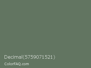 Decimal 5759071521 Color is a normal green color and the nearest color is Willow Grove #65745d. Hex code #627561 and RGB value is rgb(98,117,97). In RGB color space, this color is composed of 38% red, 46% green, 38% blue, In CMYK color space, this color is composed of 16% cyan, 0% magenta, 17% yellow , 54% black , In HSL color space, this color has a hue angle of 117° , 9% saturation and 42% lightness.