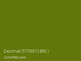 Decimal 5759071881 Color is a dark lime color and the nearest color is Avocado #568203. Hex code #627609 and RGB value is rgb(98,118,9). In RGB color space, this color is composed of 38% red, 46% green, 4% blue, In CMYK color space, this color is composed of 17% cyan, 0% magenta, 92% yellow , 54% black , In HSL color space, this color has a hue angle of 71° , 86% saturation and 25% lightness.