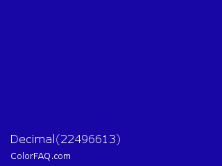 Decimal 22496613 Color is a normal indigo color and the nearest color is Ultramarine #120a8f. Hex code #1806a5 and RGB value is rgb(24,6,165). In RGB color space, this color is composed of 9% red, 2% green, 65% blue, In CMYK color space, this color is composed of 85% cyan, 96% magenta, 0% yellow , 35% black , In HSL color space, this color has a hue angle of 247° , 93% saturation and 34% lightness.
