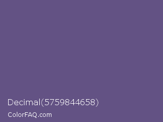 Decimal 5759844658 Color is a normal indigo color and the nearest color is Dolphin #646077. Hex code #635284 and RGB value is rgb(99,82,132). In RGB color space, this color is composed of 39% red, 32% green, 52% blue, In CMYK color space, this color is composed of 25% cyan, 38% magenta, 0% yellow , 48% black , In HSL color space, this color has a hue angle of 260° , 23% saturation and 42% lightness.