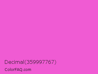 Decimal 359997767 Color is a light magenta color and the nearest color is Light Deep Pink #ff5ccd. Hex code #f05bd3 and RGB value is rgb(240,91,211). In RGB color space, this color is composed of 94% red, 36% green, 83% blue, In CMYK color space, this color is composed of 0% cyan, 62% magenta, 12% yellow , 6% black , In HSL color space, this color has a hue angle of 312° , 83% saturation and 65% lightness.