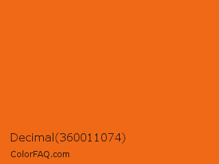 Decimal 360011074 Color is a normal orange color and the nearest color is Orange #ff681f. Hex code #f06916 and RGB value is rgb(240,105,22). In RGB color space, this color is composed of 94% red, 41% green, 9% blue, In CMYK color space, this color is composed of 0% cyan, 56% magenta, 91% yellow , 6% black , In HSL color space, this color has a hue angle of 23° , 88% saturation and 51% lightness.