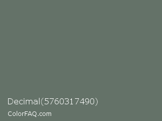 Decimal 5760317490 Color is a normal green color and the nearest color is Corduroy #606e68. Hex code #647268 and RGB value is rgb(100,114,104). In RGB color space, this color is composed of 39% red, 45% green, 41% blue, In CMYK color space, this color is composed of 12% cyan, 0% magenta, 9% yellow , 55% black , In HSL color space, this color has a hue angle of 137° , 7% saturation and 42% lightness.