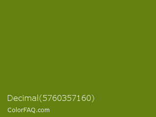 Decimal 5760357160 Color is a dark lime color and the nearest color is Avocado #568203. Hex code #648010 and RGB value is rgb(100,128,16). In RGB color space, this color is composed of 39% red, 50% green, 6% blue, In CMYK color space, this color is composed of 22% cyan, 0% magenta, 88% yellow , 50% black , In HSL color space, this color has a hue angle of 75° , 78% saturation and 28% lightness.