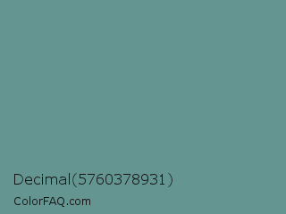 Decimal 5760378931 Color is a normal cyan color and the nearest color is Patina #639a8f. Hex code #649591 and RGB value is rgb(100,149,145). In RGB color space, this color is composed of 39% red, 58% green, 57% blue, In CMYK color space, this color is composed of 33% cyan, 0% magenta, 3% yellow , 42% black , In HSL color space, this color has a hue angle of 175° , 20% saturation and 49% lightness.