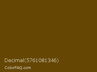 Decimal 5761081346 Color is a very dark orange color and the nearest color is Antique Bronze #704a07. Hex code #654602 and RGB value is rgb(101,70,2). In RGB color space, this color is composed of 40% red, 27% green, 1% blue, In CMYK color space, this color is composed of 0% cyan, 31% magenta, 98% yellow , 60% black , In HSL color space, this color has a hue angle of 41° , 96% saturation and 20% lightness.