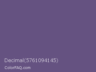 Decimal 5761094145 Color is a normal violet color and the nearest color is Dolphin #646077. Hex code #655281 and RGB value is rgb(101,82,129). In RGB color space, this color is composed of 40% red, 32% green, 51% blue, In CMYK color space, this color is composed of 22% cyan, 36% magenta, 0% yellow , 49% black , In HSL color space, this color has a hue angle of 264° , 22% saturation and 41% lightness.