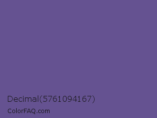 Decimal 5761094167 Color is a normal indigo color and the nearest color is Butterfly Bush #624e9a. Hex code #655291 and RGB value is rgb(101,82,145). In RGB color space, this color is composed of 40% red, 32% green, 57% blue, In CMYK color space, this color is composed of 30% cyan, 43% magenta, 0% yellow , 43% black , In HSL color space, this color has a hue angle of 258° , 28% saturation and 45% lightness.