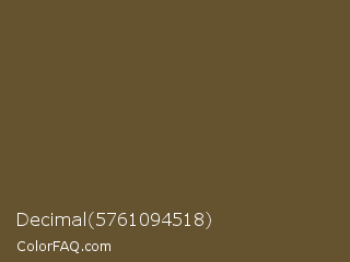 Decimal 5761094518 Color is a dark orange color and the nearest color is Shingle Fawn #6b4e31. Hex code #655330 and RGB value is rgb(101,83,48). In RGB color space, this color is composed of 40% red, 33% green, 19% blue, In CMYK color space, this color is composed of 0% cyan, 18% magenta, 52% yellow , 60% black , In HSL color space, this color has a hue angle of 40° , 36% saturation and 29% lightness.