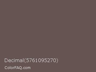 Decimal 5761095270 Color is a normal red color and the nearest color is Wenge #645452. Hex code #655452 and RGB value is rgb(101,84,82). In RGB color space, this color is composed of 40% red, 33% green, 32% blue, In CMYK color space, this color is composed of 0% cyan, 17% magenta, 19% yellow , 60% black , In HSL color space, this color has a hue angle of 6° , 10% saturation and 36% lightness.