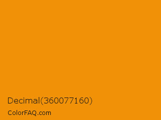 Decimal 360077160 Color is a normal orange color and the nearest color is Tangerine #f28500. Hex code #f09108 and RGB value is rgb(240,145,8). In RGB color space, this color is composed of 94% red, 57% green, 3% blue, In CMYK color space, this color is composed of 0% cyan, 40% magenta, 97% yellow , 6% black , In HSL color space, this color has a hue angle of 35° , 94% saturation and 49% lightness.