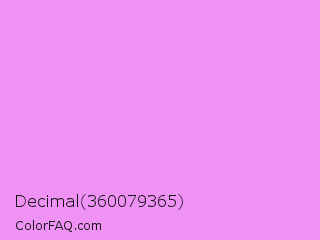 Decimal 360079365 Color is a light magenta color and the nearest color is Lavender Magenta #ee82ee. Hex code #f091f5 and RGB value is rgb(240,145,245). In RGB color space, this color is composed of 94% red, 57% green, 96% blue, In CMYK color space, this color is composed of 2% cyan, 41% magenta, 0% yellow , 4% black , In HSL color space, this color has a hue angle of 297° , 83% saturation and 76% lightness.
