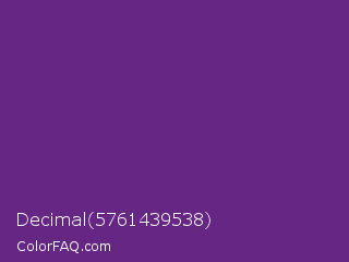 Decimal 5761439538 Color is a normal purple color and the nearest color is Eminence #6c3082. Hex code #662784 and RGB value is rgb(102,39,132). In RGB color space, this color is composed of 40% red, 15% green, 52% blue, In CMYK color space, this color is composed of 23% cyan, 70% magenta, 0% yellow , 48% black , In HSL color space, this color has a hue angle of 281° , 54% saturation and 34% lightness.