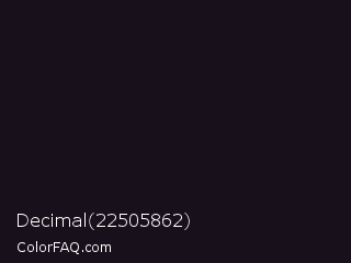 Decimal 22505862 Color is a almost black purple color and the nearest color is Vulcan #10121d. Hex code #18101a and RGB value is rgb(24,16,26). In RGB color space, this color is composed of 9% red, 6% green, 10% blue, In CMYK color space, this color is composed of 8% cyan, 38% magenta, 0% yellow , 90% black , In HSL color space, this color has a hue angle of 288° , 24% saturation and 8% lightness.