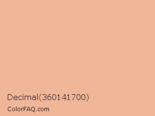 Decimal 360141700 Color is a light orange color and the nearest color is Rose Bud #fbb2a3. Hex code #f0b698 and RGB value is rgb(240,182,152). In RGB color space, this color is composed of 94% red, 71% green, 60% blue, In CMYK color space, this color is composed of 0% cyan, 24% magenta, 37% yellow , 6% black , In HSL color space, this color has a hue angle of 20° , 75% saturation and 77% lightness.