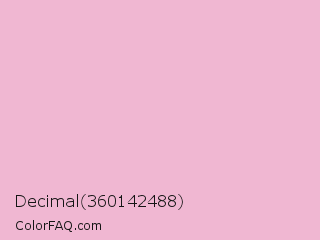 Decimal 360142488 Color is a very light rose color and the nearest color is Cameo Pink #efbbcc. Hex code #f0b7d2 and RGB value is rgb(240,183,210). In RGB color space, this color is composed of 94% red, 72% green, 82% blue, In CMYK color space, this color is composed of 0% cyan, 24% magenta, 13% yellow , 6% black , In HSL color space, this color has a hue angle of 332° , 66% saturation and 83% lightness.