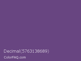 Decimal 5763138689 Color is a normal purple color and the nearest color is Cyber Grape #58427c. Hex code #684581 and RGB value is rgb(104,69,129). In RGB color space, this color is composed of 41% red, 27% green, 51% blue, In CMYK color space, this color is composed of 19% cyan, 47% magenta, 0% yellow , 49% black , In HSL color space, this color has a hue angle of 275° , 30% saturation and 39% lightness.