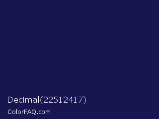 Decimal 22512417 Color is a very dark indigo color and the nearest color is Bunting #151f4c. Hex code #181551 and RGB value is rgb(24,21,81). In RGB color space, this color is composed of 9% red, 8% green, 32% blue, In CMYK color space, this color is composed of 70% cyan, 74% magenta, 0% yellow , 68% black , In HSL color space, this color has a hue angle of 243° , 59% saturation and 20% lightness.