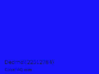 Decimal 22512784 Color is a normal indigo color and the nearest color is Bluebonnet #1c1cf0. Hex code #1815fa and RGB value is rgb(24,21,250). In RGB color space, this color is composed of 9% red, 8% green, 98% blue, In CMYK color space, this color is composed of 90% cyan, 92% magenta, 0% yellow , 2% black , In HSL color space, this color has a hue angle of 241° , 96% saturation and 53% lightness.