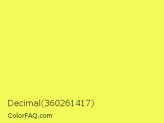 Decimal 360261417 Color is a light yellow color and the nearest color is Canary #f3fb62. Hex code #f0fa59 and RGB value is rgb(240,250,89). In RGB color space, this color is composed of 94% red, 98% green, 35% blue, In CMYK color space, this color is composed of 4% cyan, 0% magenta, 64% yellow , 2% black , In HSL color space, this color has a hue angle of 64° , 94% saturation and 66% lightness.