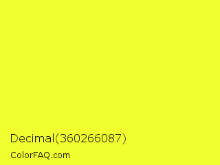 Decimal 360266087 Color is a normal yellow color and the nearest color is Maximum Yellow #fafa37. Hex code #f0ff2f and RGB value is rgb(240,255,47). In RGB color space, this color is composed of 94% red, 100% green, 18% blue, In CMYK color space, this color is composed of 6% cyan, 0% magenta, 82% yellow , 0% black , In HSL color space, this color has a hue angle of 64° , 100% saturation and 59% lightness.
