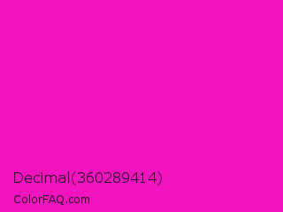 Decimal 360289414 Color is a normal magenta color and the nearest color is Shocking Pink #fc0fc0. Hex code #f114be and RGB value is rgb(241,20,190). In RGB color space, this color is composed of 95% red, 8% green, 75% blue, In CMYK color space, this color is composed of 0% cyan, 92% magenta, 21% yellow , 5% black , In HSL color space, this color has a hue angle of 314° , 89% saturation and 51% lightness.